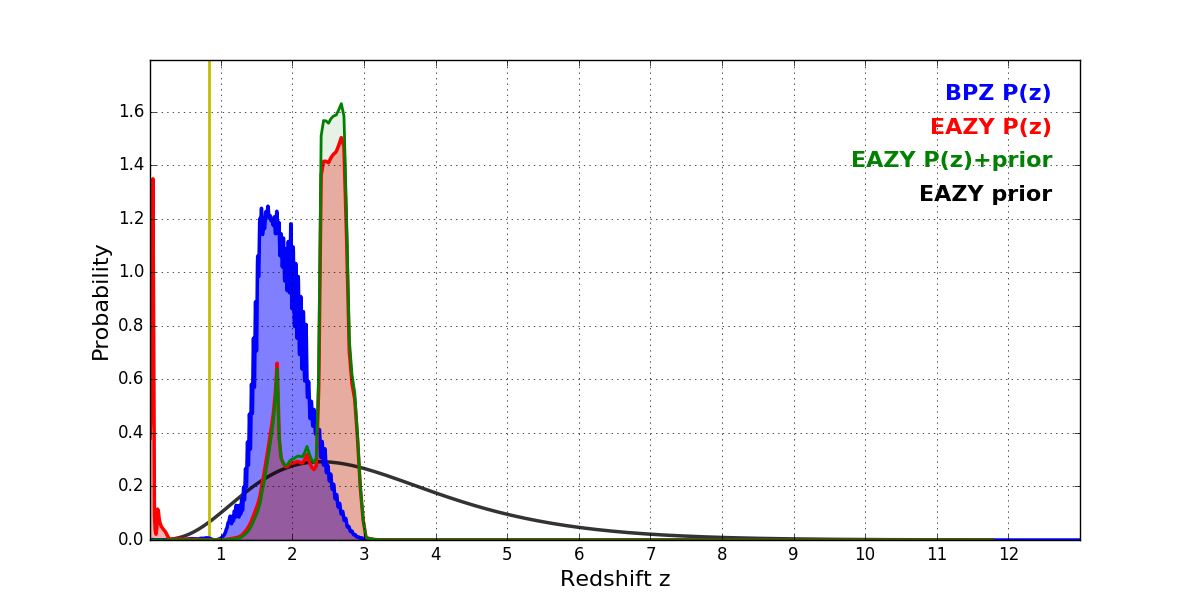 In P(z) plots: Yellow lines mark the cluster redshift z = 0.833,