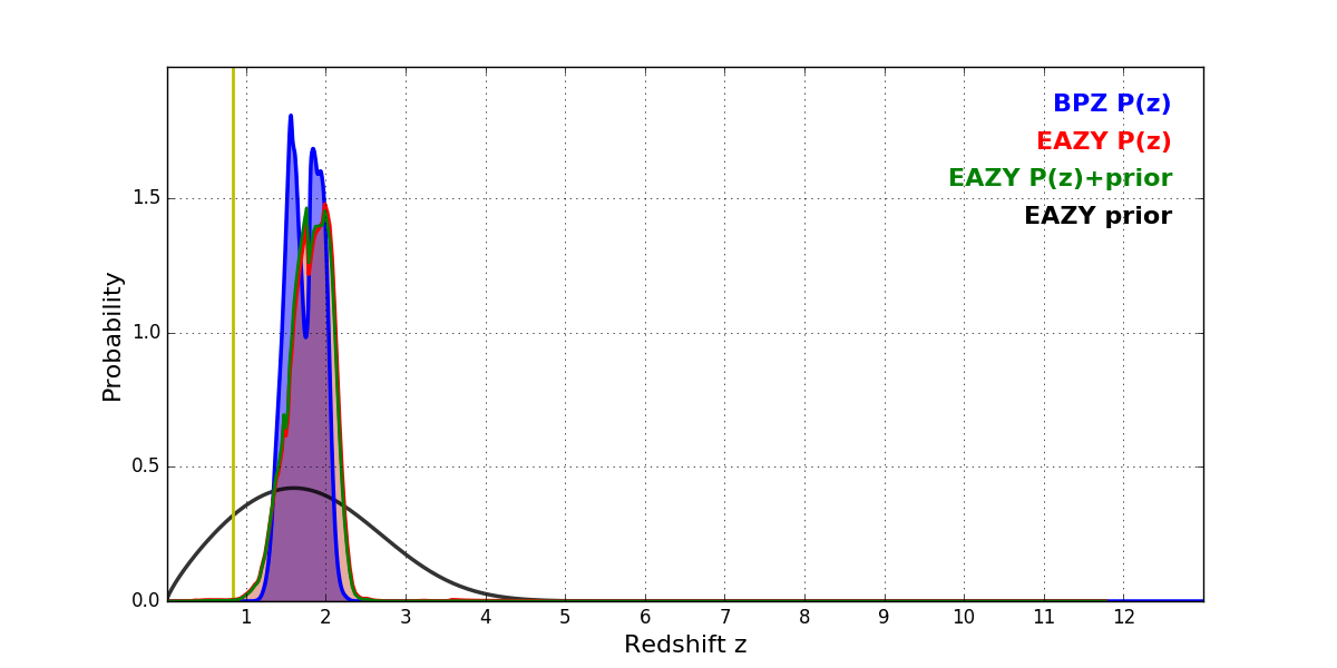 In P(z) plots: Yellow lines mark the cluster redshift z = 0.833,