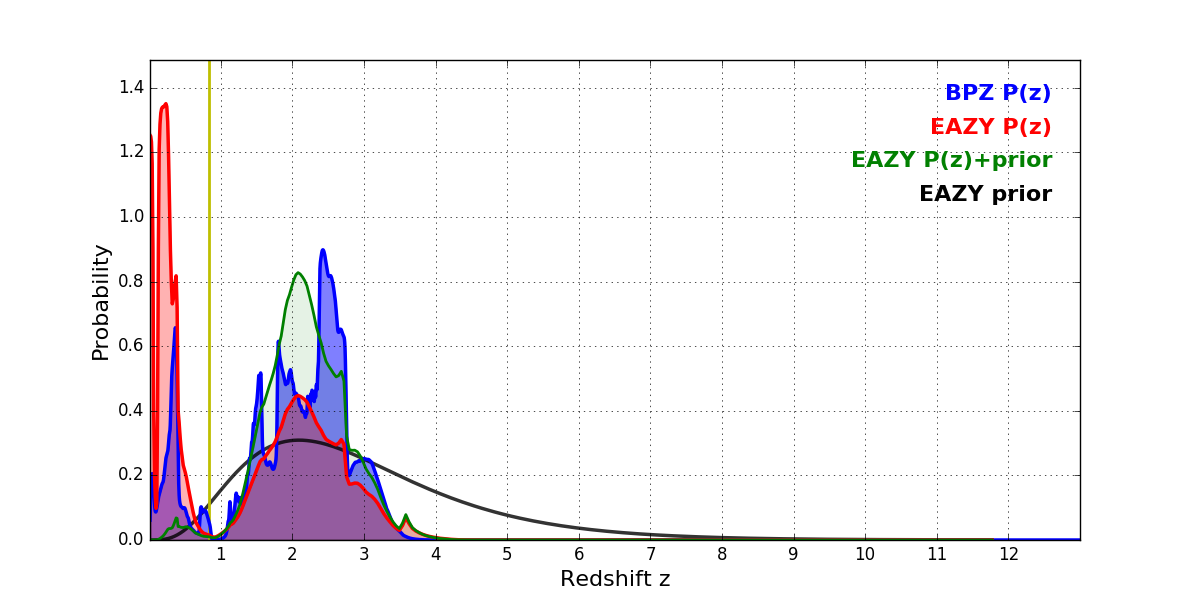 In P(z) plots: Yellow lines mark the cluster redshift z = 0.833,