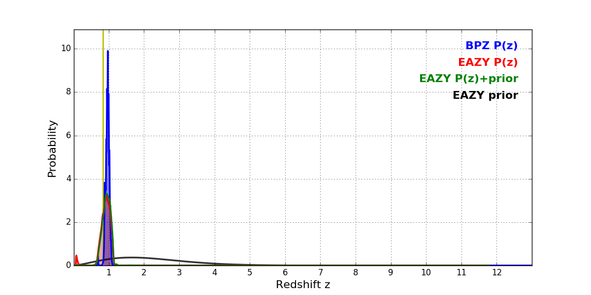 In P(z) plots: Yellow lines mark the cluster redshift z = 0.833,