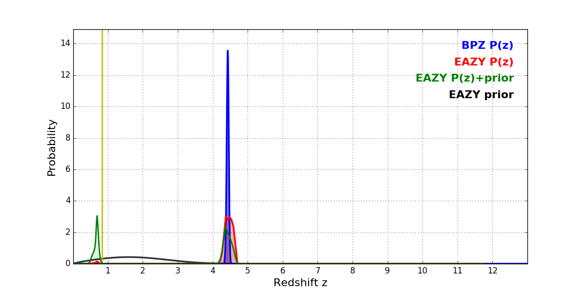 In P(z) plots: Yellow lines mark the cluster redshift z = 0.833,