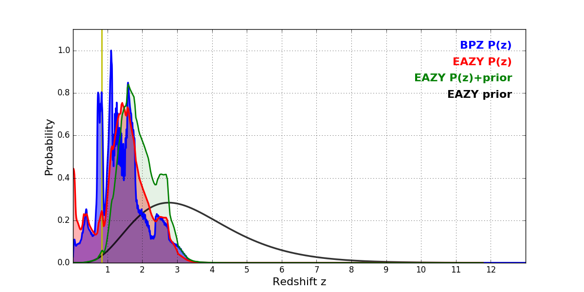 In P(z) plots: Yellow lines mark the cluster redshift z = 0.833,