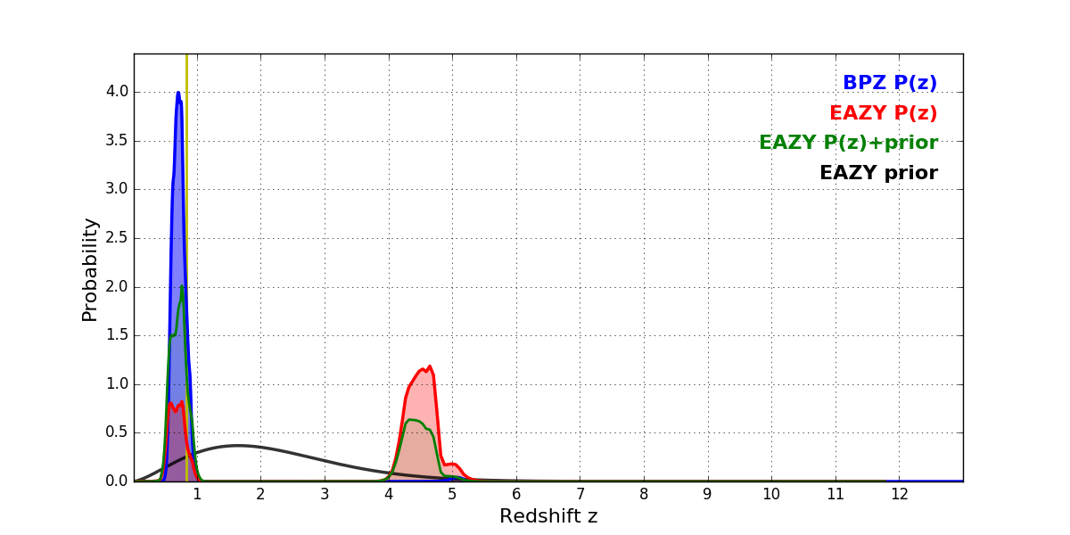 In P(z) plots: Yellow lines mark the cluster redshift z = 0.833,
