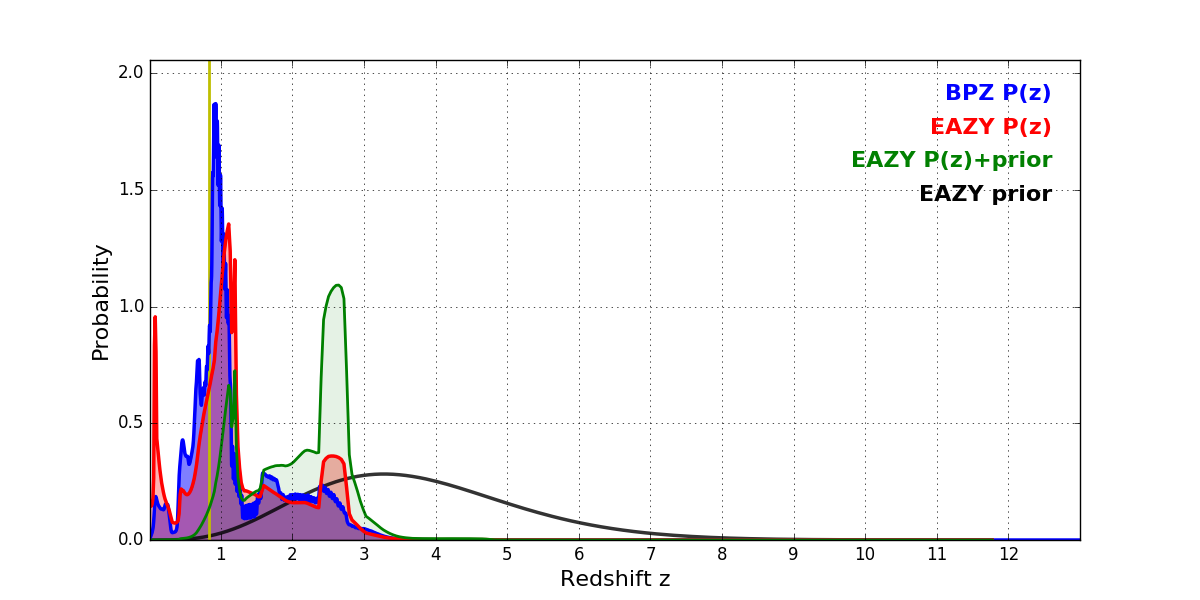 In P(z) plots: Yellow lines mark the cluster redshift z = 0.833,
