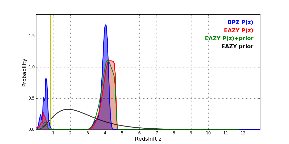 In P(z) plots: Yellow lines mark the cluster redshift z = 0.833,