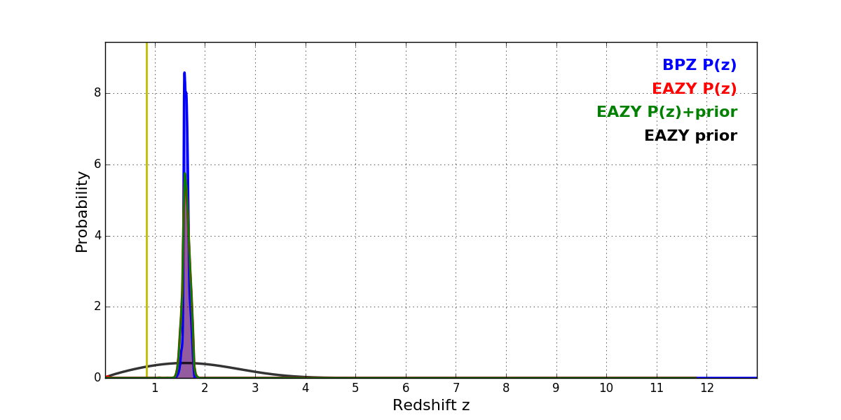 In P(z) plots: Yellow lines mark the cluster redshift z = 0.833,