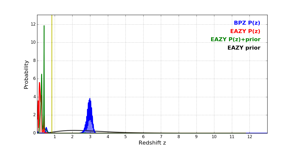In P(z) plots: Yellow lines mark the cluster redshift z = 0.833,