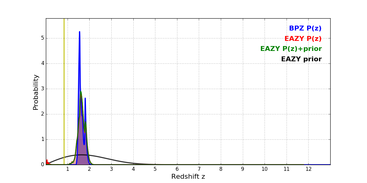 In P(z) plots: Yellow lines mark the cluster redshift z = 0.833,