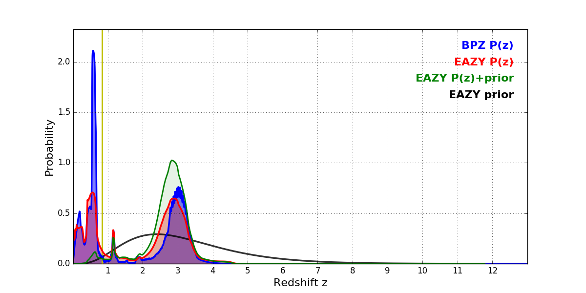 In P(z) plots: Yellow lines mark the cluster redshift z = 0.833,