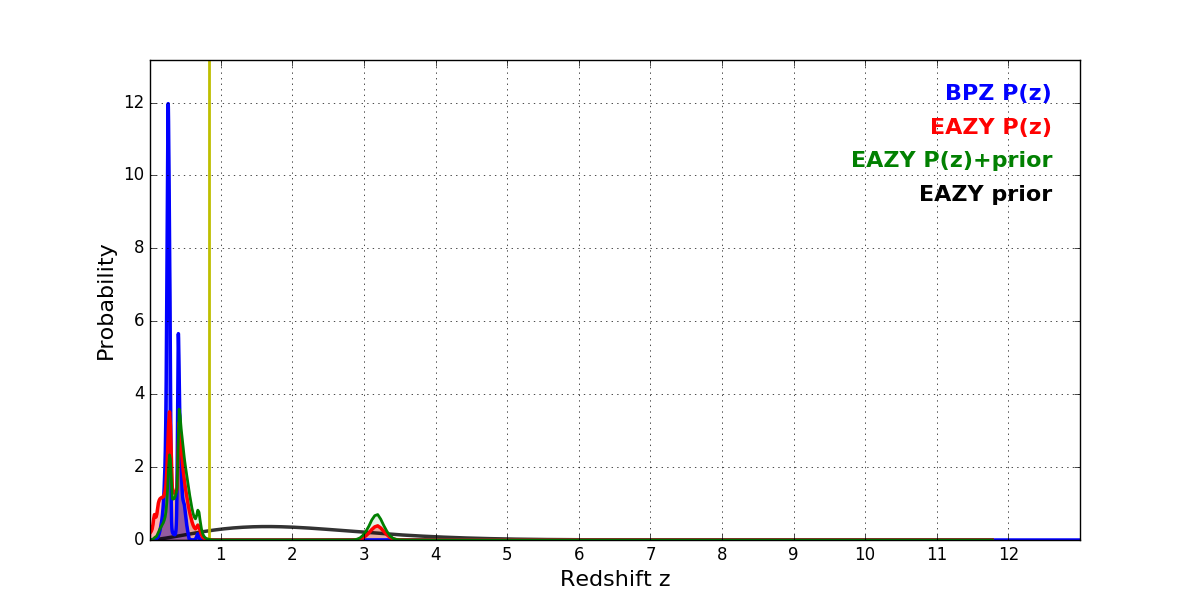 In P(z) plots: Yellow lines mark the cluster redshift z = 0.833,