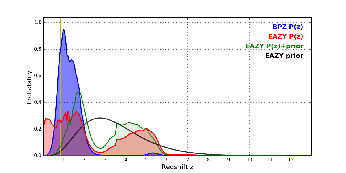 In P(z) plots: Yellow lines mark the cluster redshift z = 0.833,