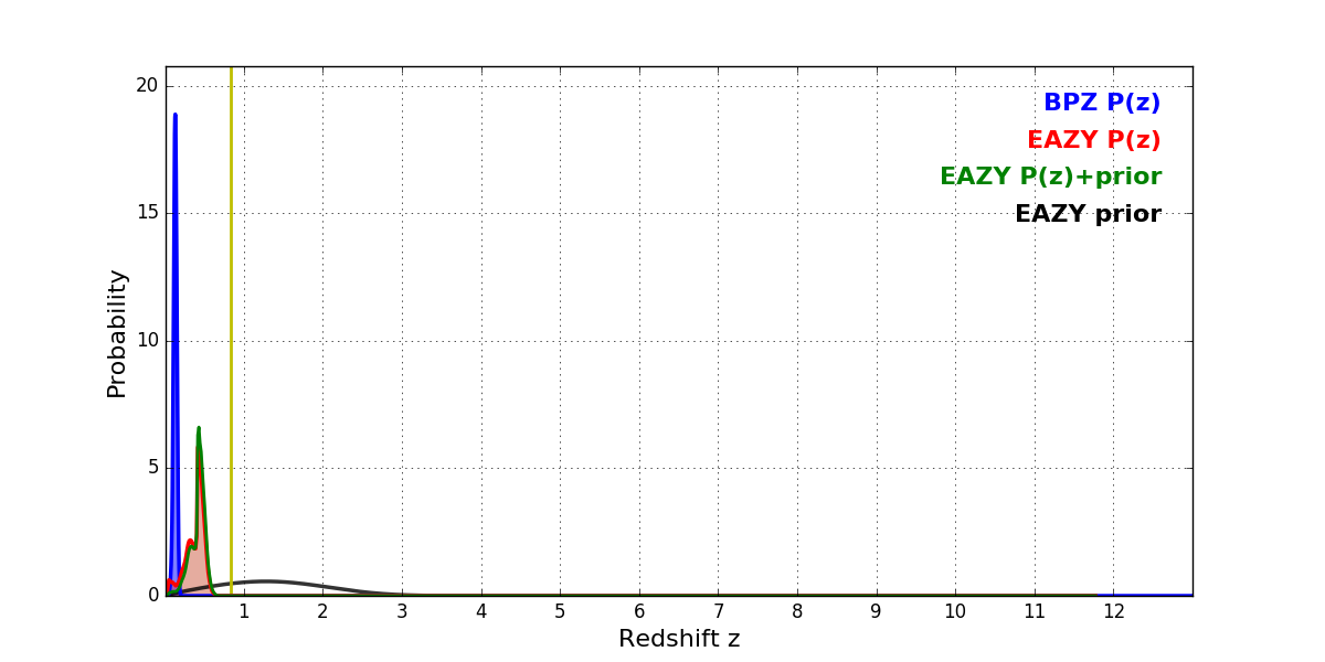 In P(z) plots: Yellow lines mark the cluster redshift z = 0.833,