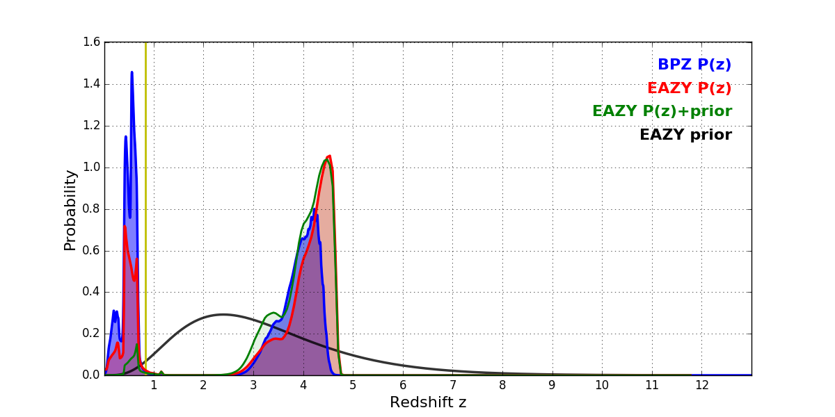 In P(z) plots: Yellow lines mark the cluster redshift z = 0.833,