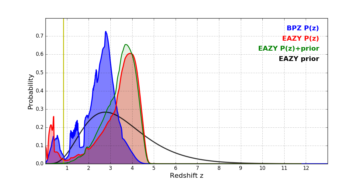 In P(z) plots: Yellow lines mark the cluster redshift z = 0.833,