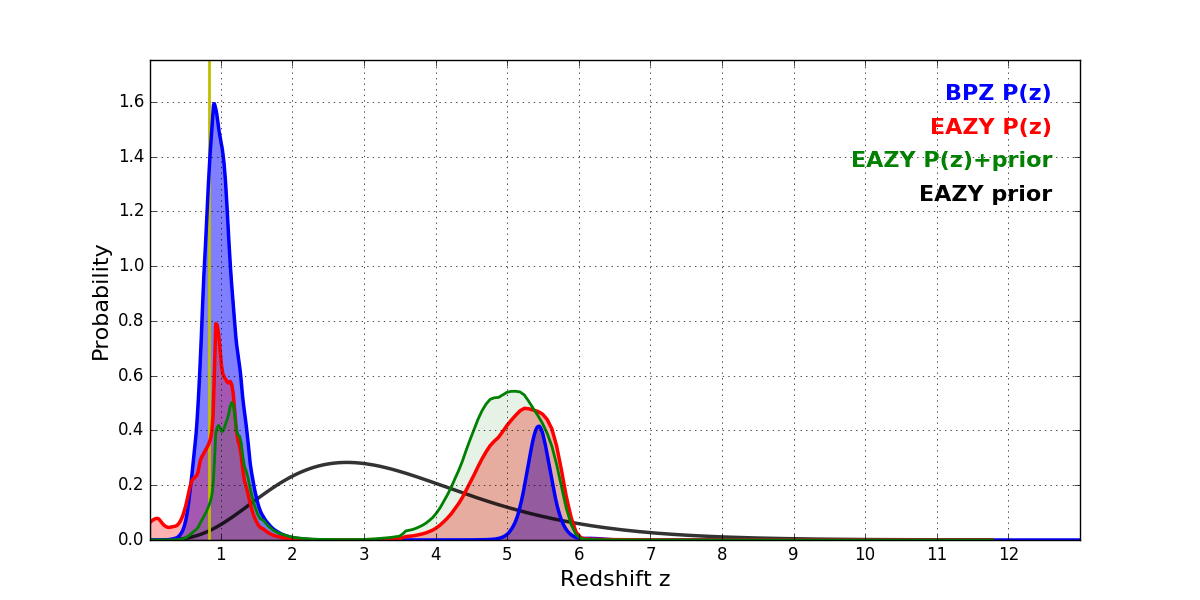 In P(z) plots: Yellow lines mark the cluster redshift z = 0.833,