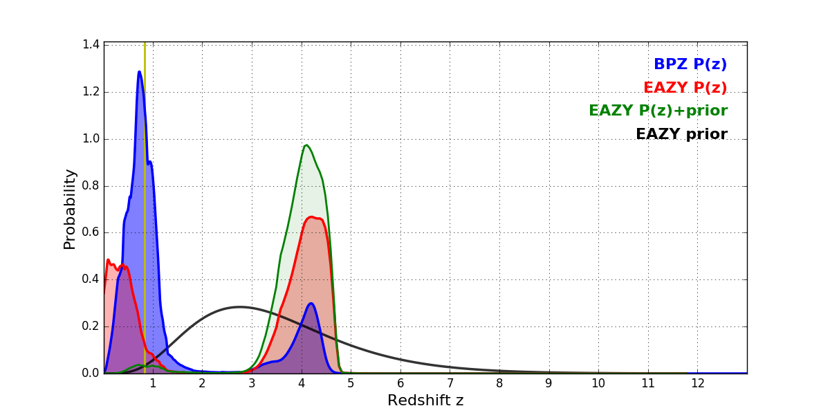 In P(z) plots: Yellow lines mark the cluster redshift z = 0.833,