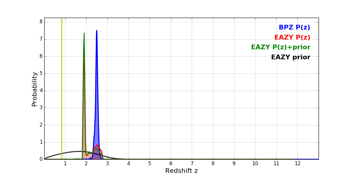 In P(z) plots: Yellow lines mark the cluster redshift z = 0.833,