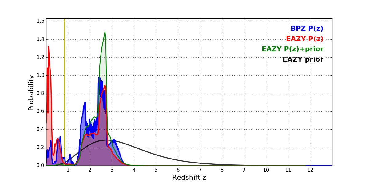 In P(z) plots: Yellow lines mark the cluster redshift z = 0.833,