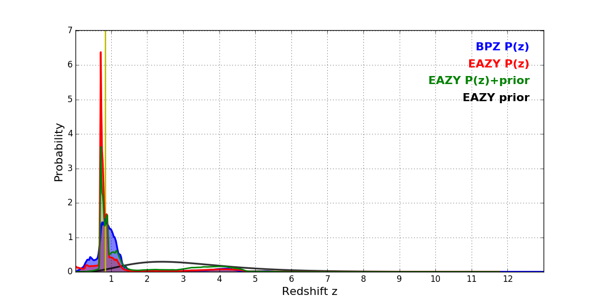 In P(z) plots: Yellow lines mark the cluster redshift z = 0.833,