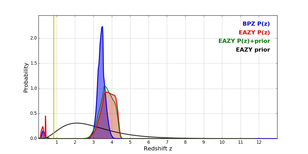 In P(z) plots: Yellow lines mark the cluster redshift z = 0.833,