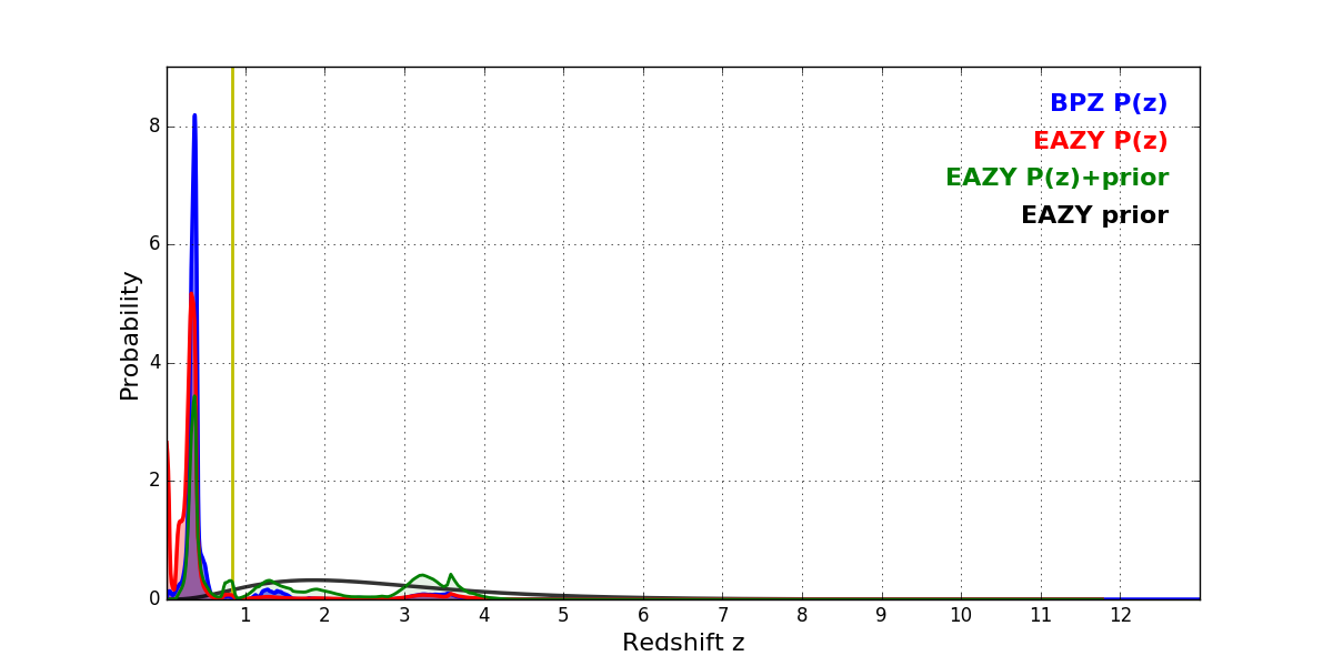In P(z) plots: Yellow lines mark the cluster redshift z = 0.833,