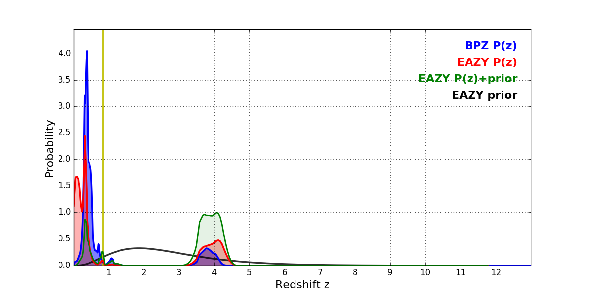 In P(z) plots: Yellow lines mark the cluster redshift z = 0.833,