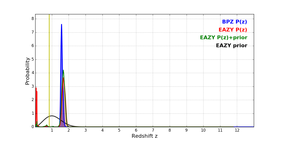 In P(z) plots: Yellow lines mark the cluster redshift z = 0.833,