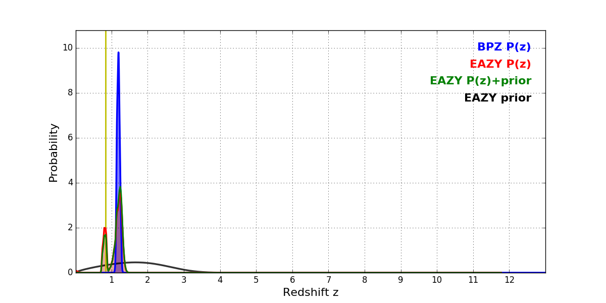In P(z) plots: Yellow lines mark the cluster redshift z = 0.833,