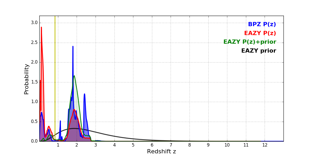 In P(z) plots: Yellow lines mark the cluster redshift z = 0.833,