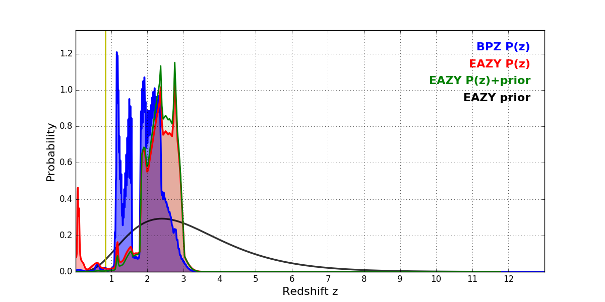 In P(z) plots: Yellow lines mark the cluster redshift z = 0.833,