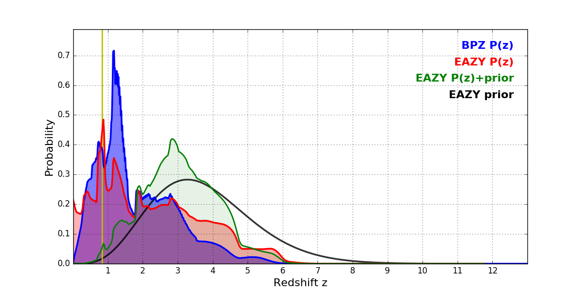 In P(z) plots: Yellow lines mark the cluster redshift z = 0.833,
