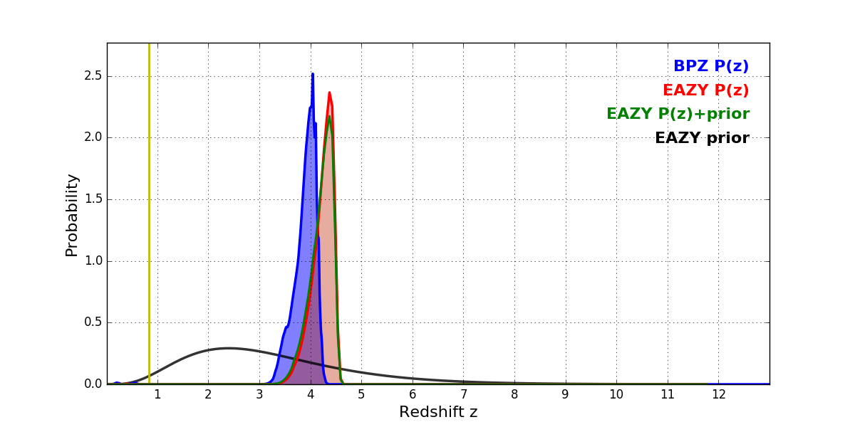 In P(z) plots: Yellow lines mark the cluster redshift z = 0.833,