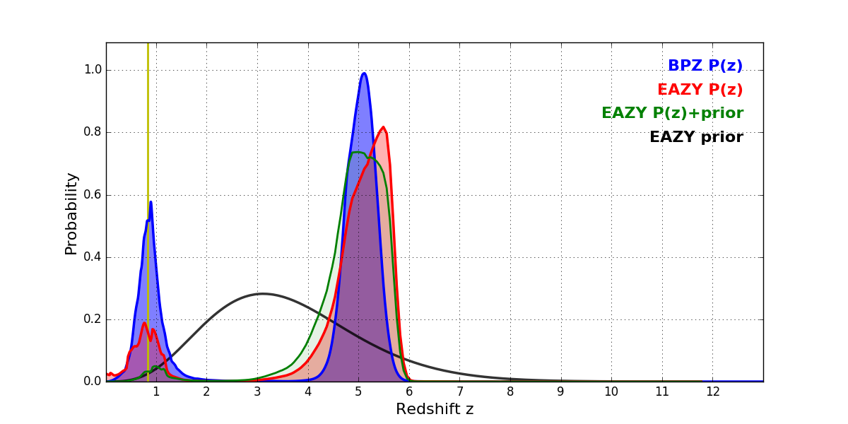 In P(z) plots: Yellow lines mark the cluster redshift z = 0.833,