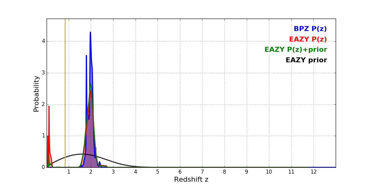 In P(z) plots: Yellow lines mark the cluster redshift z = 0.833,