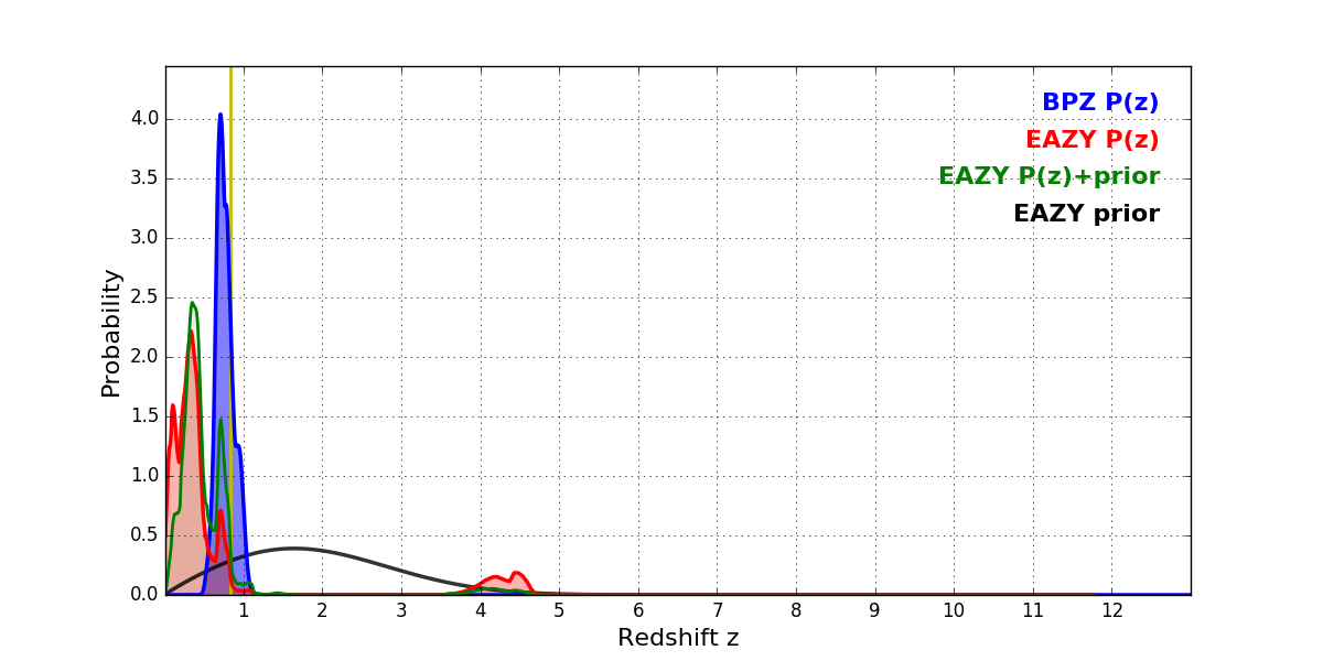 In P(z) plots: Yellow lines mark the cluster redshift z = 0.833,