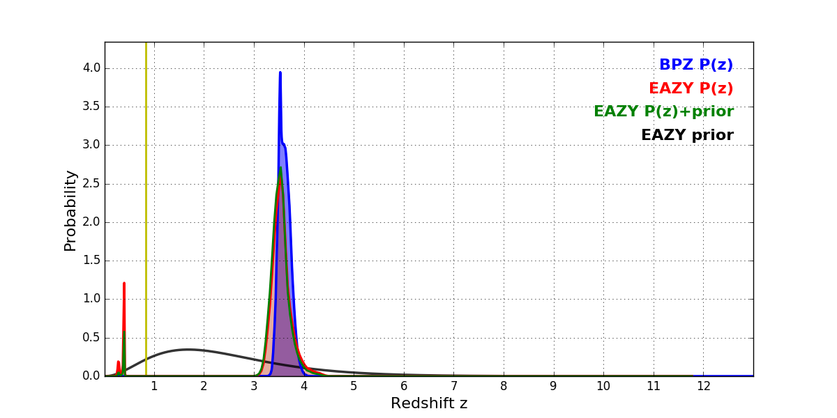 In P(z) plots: Yellow lines mark the cluster redshift z = 0.833,