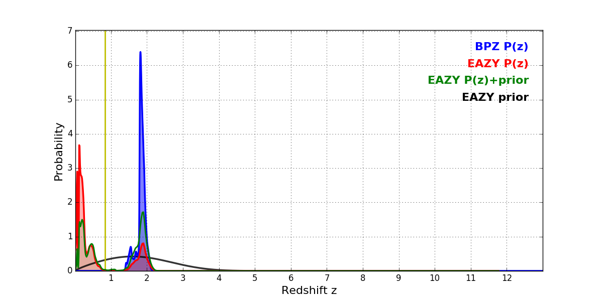 In P(z) plots: Yellow lines mark the cluster redshift z = 0.833,