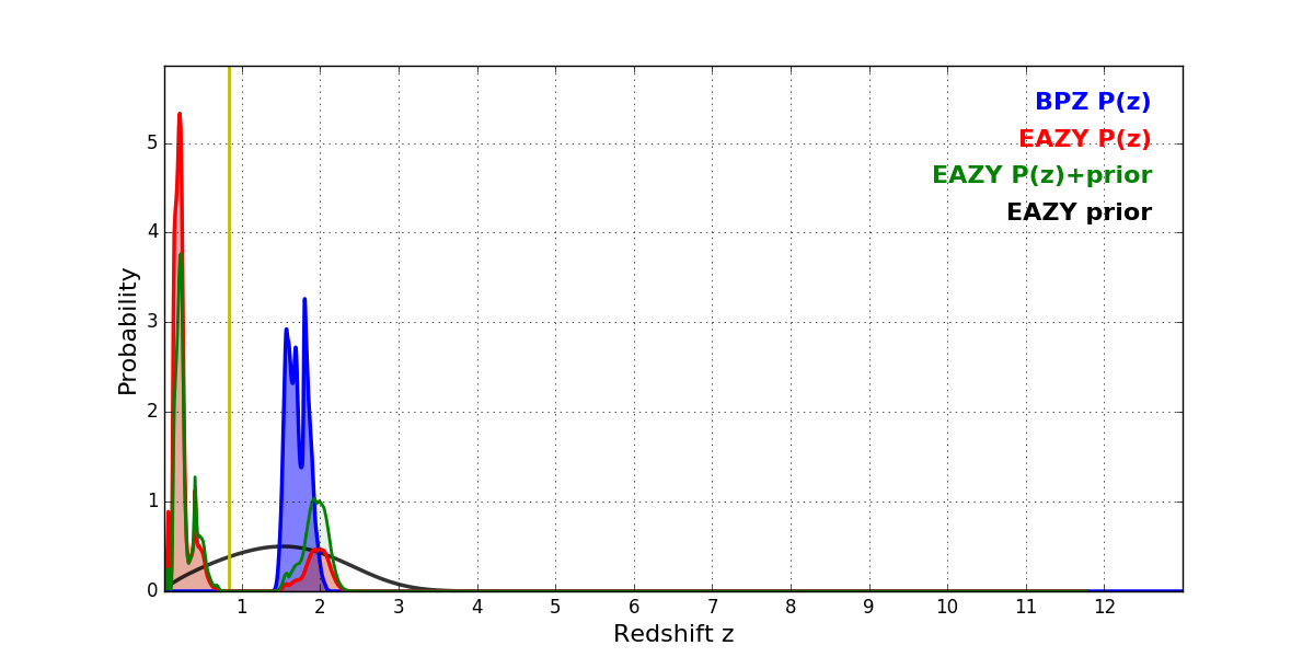 In P(z) plots: Yellow lines mark the cluster redshift z = 0.833,