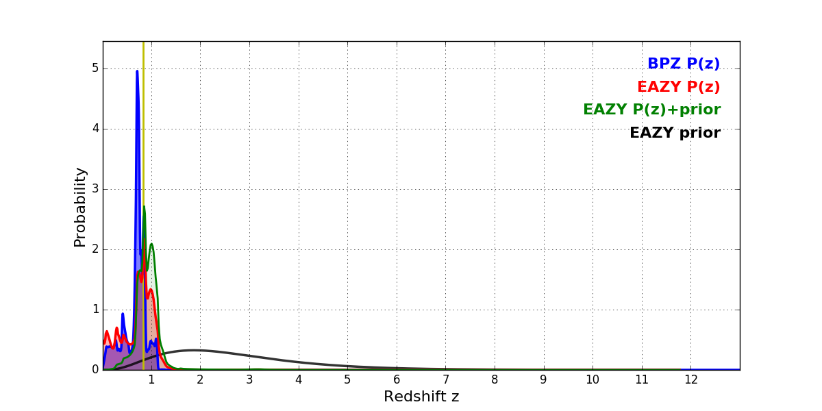 In P(z) plots: Yellow lines mark the cluster redshift z = 0.833,