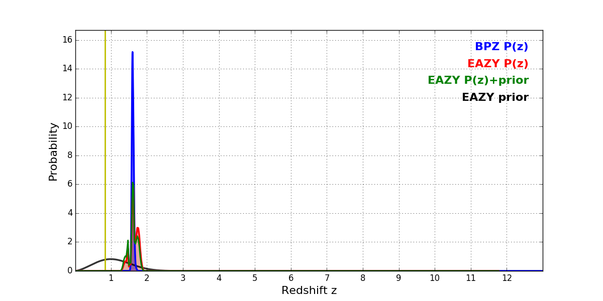 In P(z) plots: Yellow lines mark the cluster redshift z = 0.833,