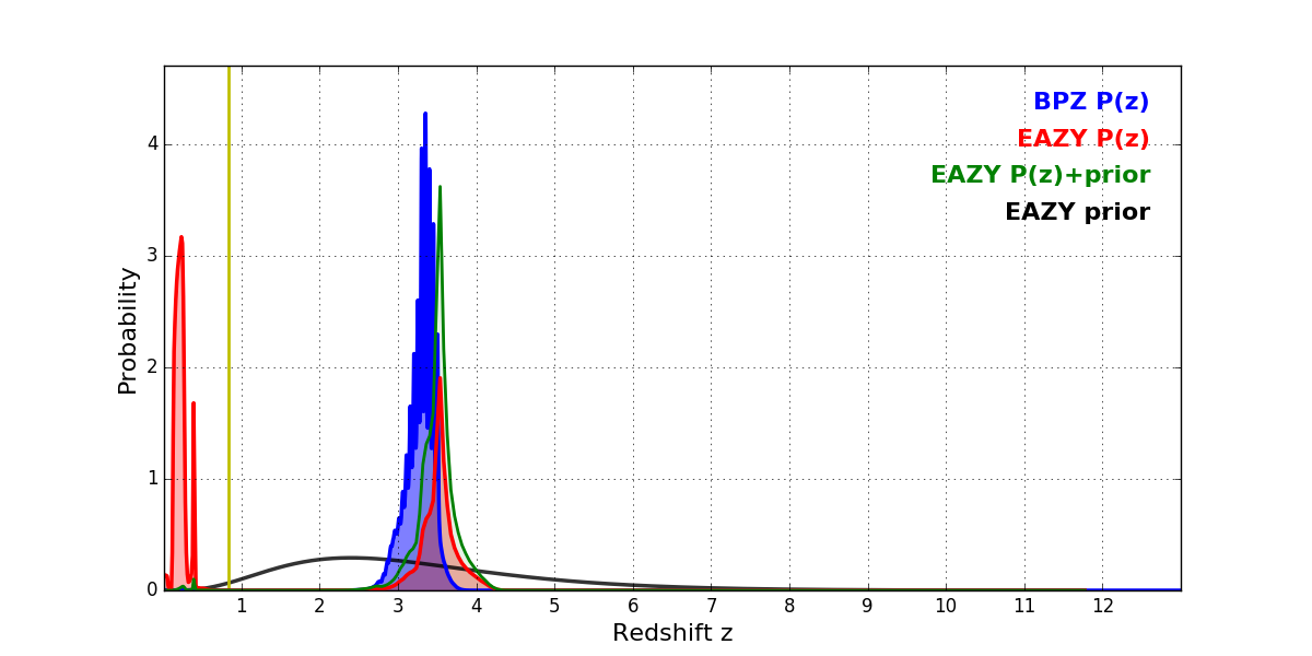 In P(z) plots: Yellow lines mark the cluster redshift z = 0.833,