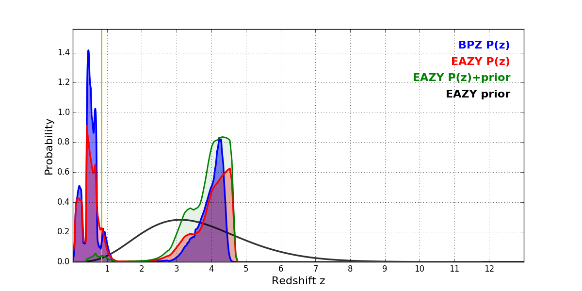 In P(z) plots: Yellow lines mark the cluster redshift z = 0.833,
