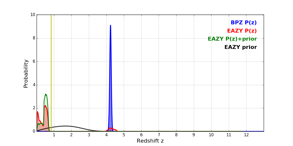 In P(z) plots: Yellow lines mark the cluster redshift z = 0.833,