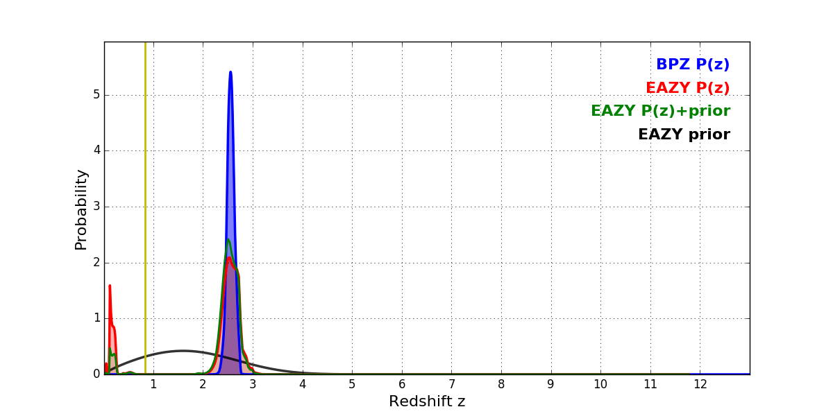 In P(z) plots: Yellow lines mark the cluster redshift z = 0.833,
