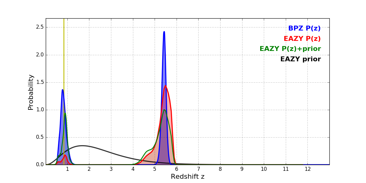 In P(z) plots: Yellow lines mark the cluster redshift z = 0.833,