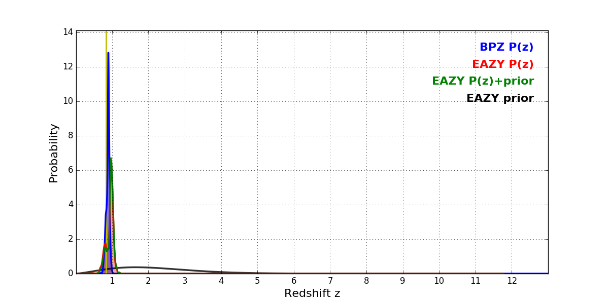 In P(z) plots: Yellow lines mark the cluster redshift z = 0.833,