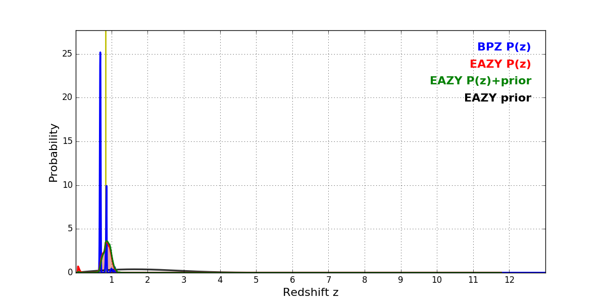 In P(z) plots: Yellow lines mark the cluster redshift z = 0.833,