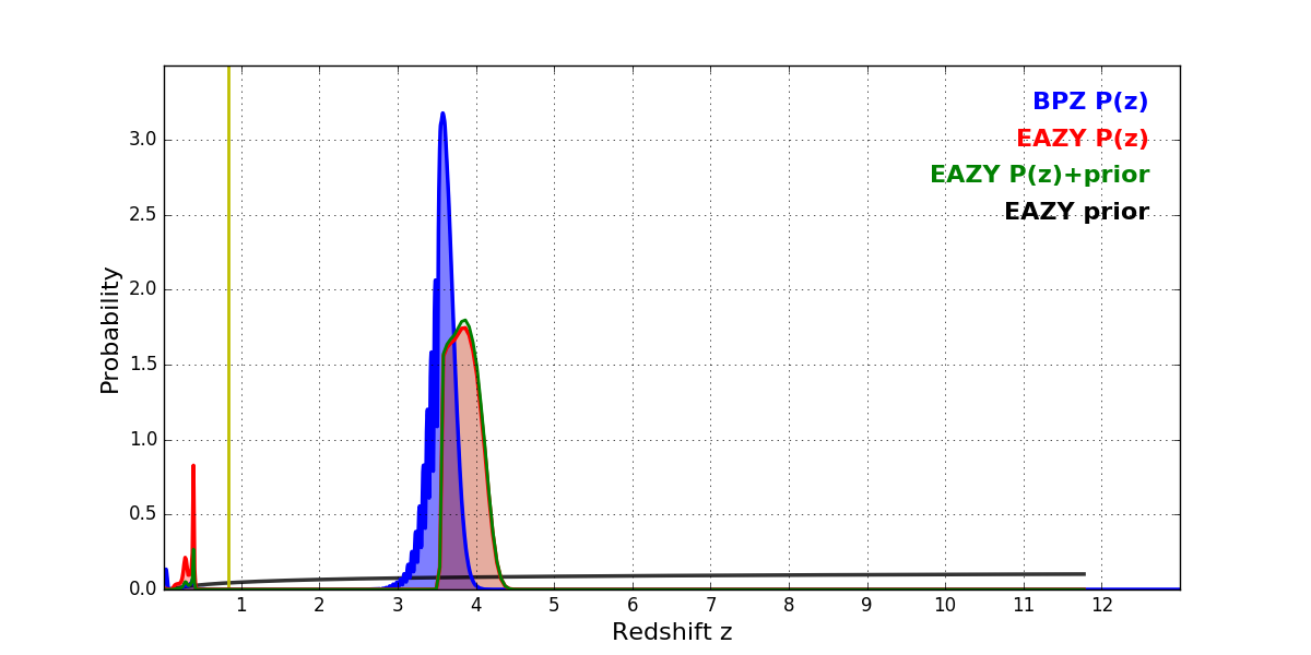 In P(z) plots: Yellow lines mark the cluster redshift z = 0.833,