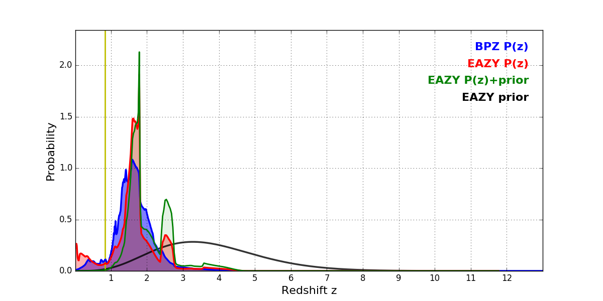 In P(z) plots: Yellow lines mark the cluster redshift z = 0.833,