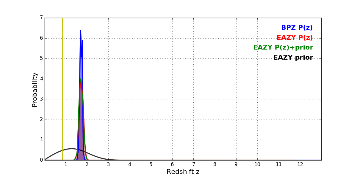 In P(z) plots: Yellow lines mark the cluster redshift z = 0.833,